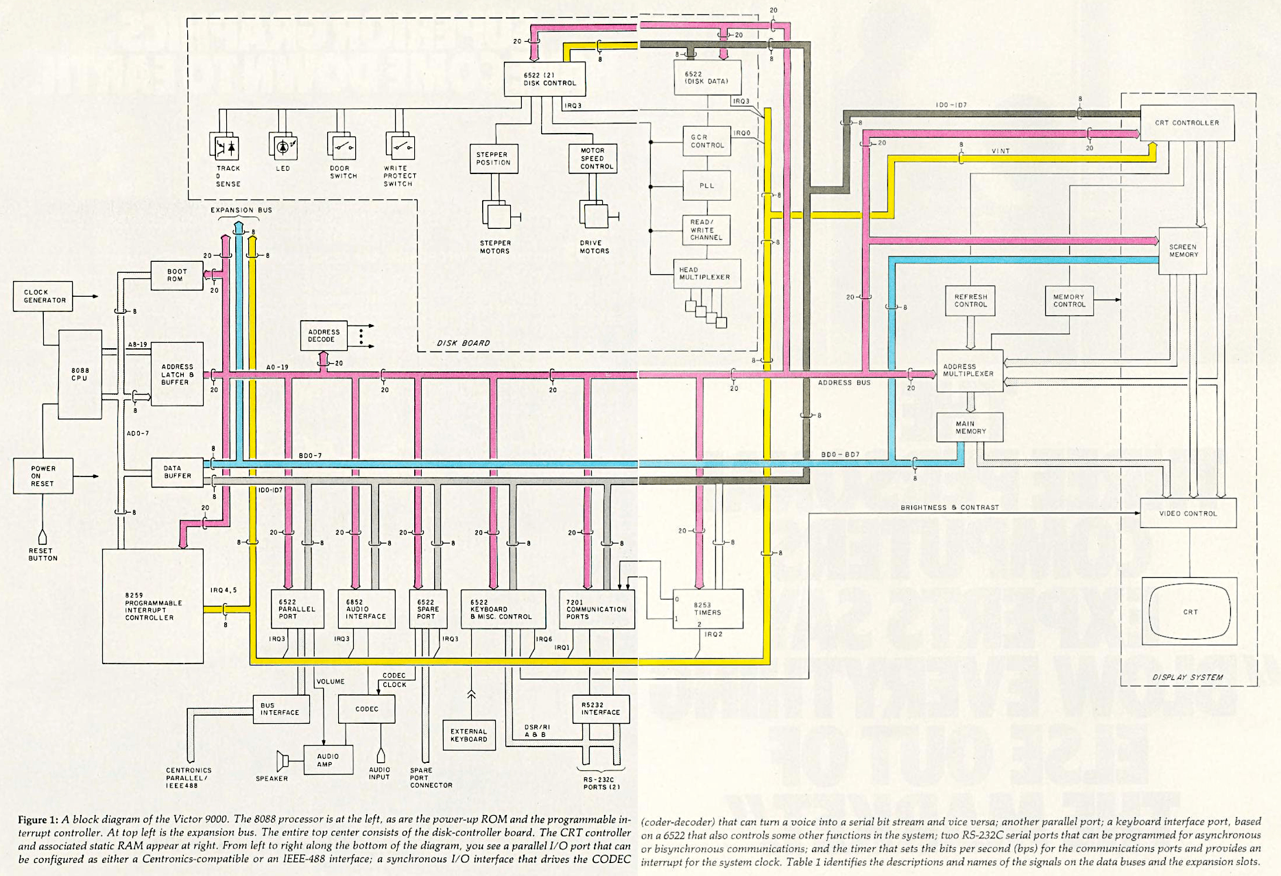 The 8088 is a 16-bit microprocessor that does all I/O 8 bits at a time. Two separate 8-bit data buses, the ID bus and the BD bus, are in use in the Victor 9000. All the Victor 9000’s LSI (large-scale integration) I/O devices (including the ones on the disk-controller board) are driven from a separate data bus consisting of lines ID0-ID7. Memory, the expansion bus (see table 1 on page 230), and the buffers for the ID bus are driven by the bus consisting of lines BD0-BD7. The programmable interrupt controller and the “boot” ROM connect directly to the processor data bus.